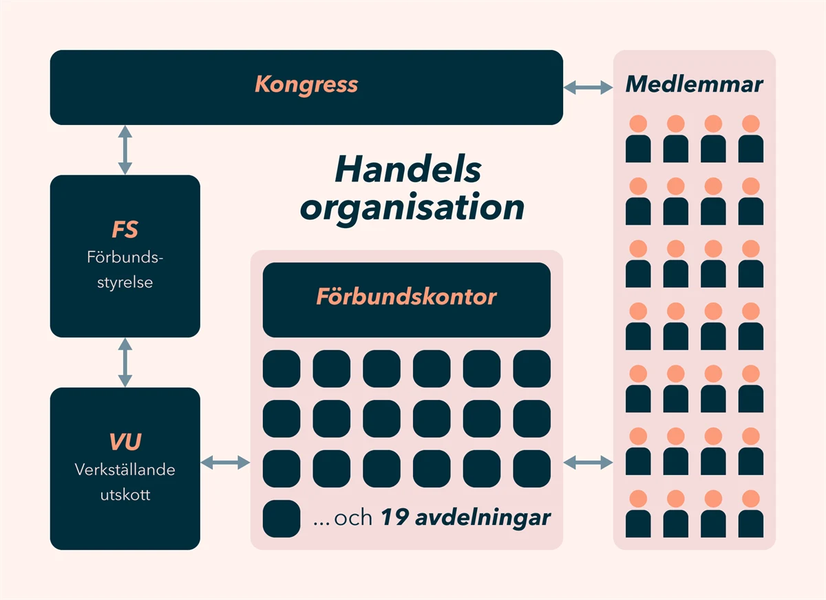 Här kan du läsa mer om hur Handels är uppbyggt, från fackklubben på den enskilda arbetsplatsen till förbundsstyrelsen.